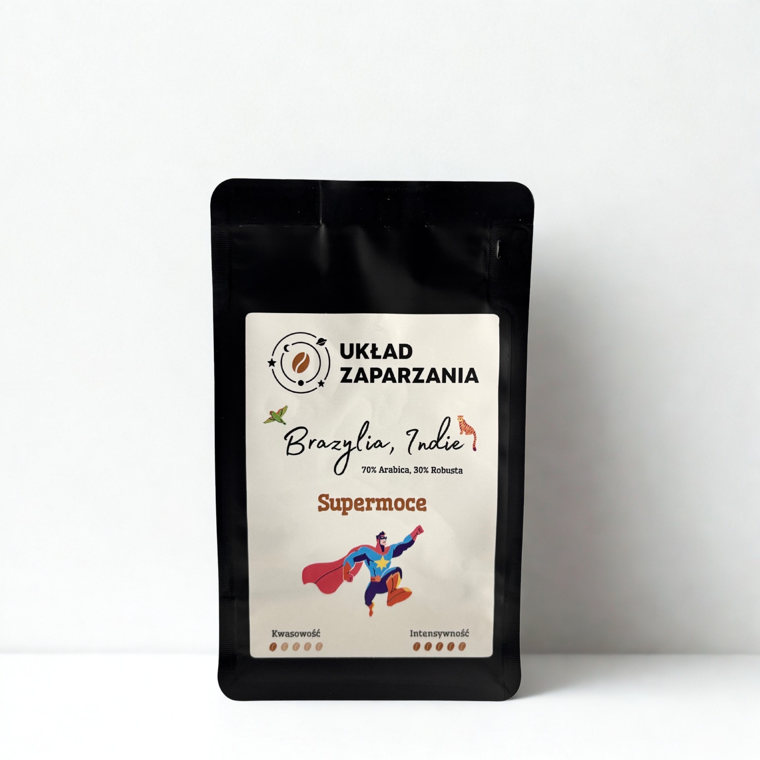 Brazylia/Indie Supermoce to nieco ciemniej palona mieszanka – leciutkiej arabiki z Brazylii i zdecydowanie bardziej intensywnej robusty z Indii. Dodatek robusty zwiększa zawartość kofeiny, co prowadzi do silniejszej goryczki i większego pobudzenia. W smaku zdecydowanie przeważa słodycz z wyczuwalnymi nutami czekolady, orzechów oraz kakao. Świetnie sprawdzi się zarówno w kawach czanych jak i mlecznych. “ Supermoce” to magiczny napój, który pomoże pokonać nam nawet największe zmęczenie. Dzięki niemu nasze cele i marzenia znów będą na wyciągnięcie ręki